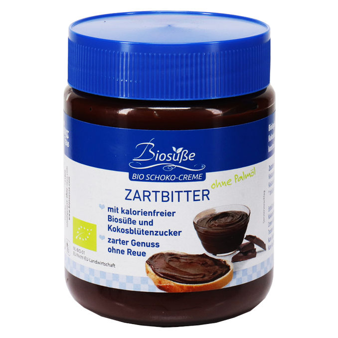 Die Bio Schoko-Creme Zartbitter ist ein cremiger Schokoaufstrich mit kalorienfreier Biosüße und Kokosblütenzucker.