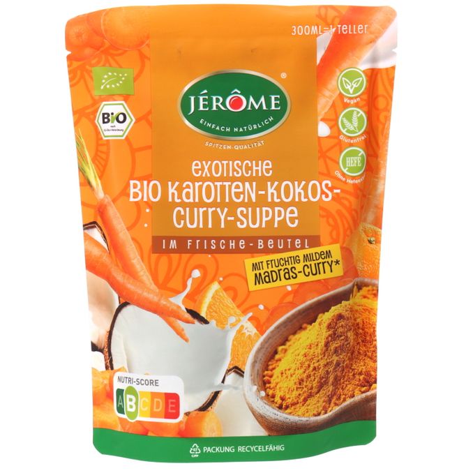 Die Bio Karotten-Kokos-Curry-Suppe bietet einen fruchtig milden Geschmack durch Madras-Curry. Sie ist frei von Geschmacksverstärkern und künstlichen Aromen.