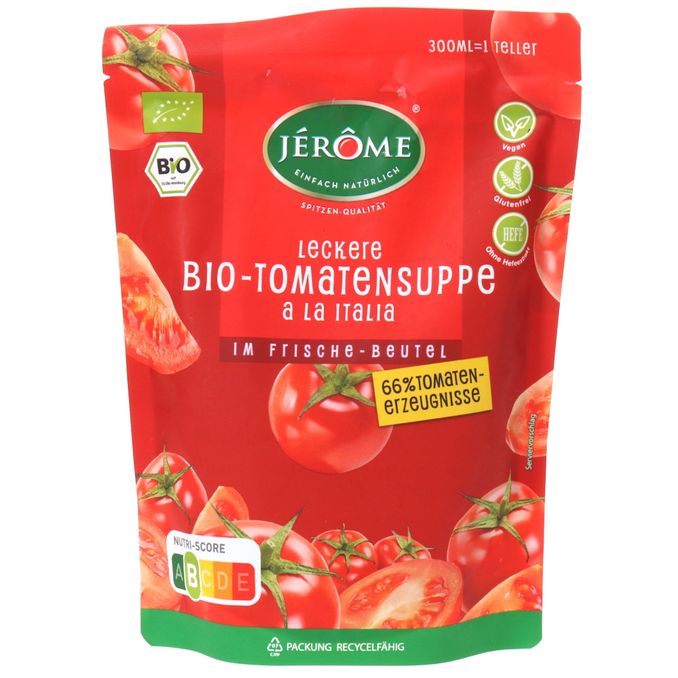 Die Bio Tomatensuppe á la Italia enthält 66 % Bio-Tomaten-Erzeugnisse. Sie ist frei von Geschmacksverstärkern und künstlichen Aromen.